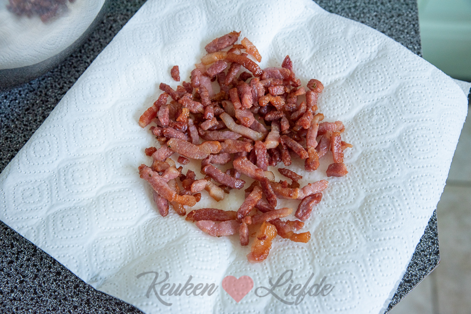 Bak de spekjes op middellaag vuur langzaam uit. Scheur de sla in kleinere stukken. Hak 1 ei fijn, snijd het andere ei in plakjes.