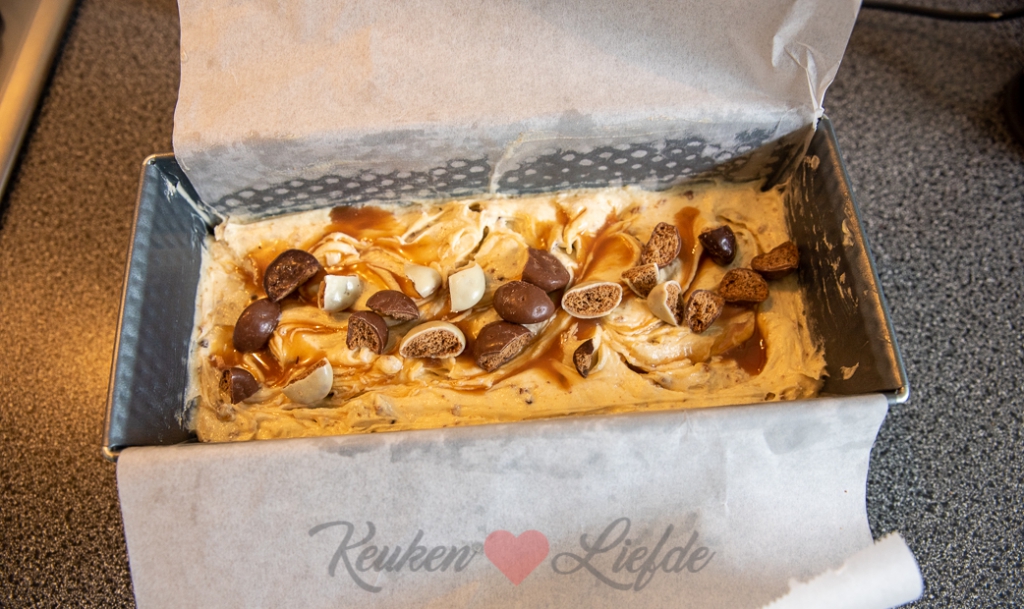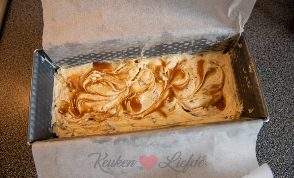 Roer in een kom het bakmeel en snuf zout door elkaar. Zeef het bakmeel boven het cakebeslag en spatel er luchtig doorheen. Hak de kruidnoten grof (ik doe de kruidnoten in een afsluitbare diepvrieszak en geef ze een flinke tik met de deegroller). Spatel de kruidnoten door het cakebeslag. Verdeel het cakebeslag in de cakevorm en strijk de bovenkant glad. Schep hier en daar wat theelepels karamelsaus op de cake en swirl met de achterkant van de lepel door het cakebeslag, zodat je een mooi patroon krijgt. Hak de overige kruidnoten grof met een mes en strooi ze over de cake.