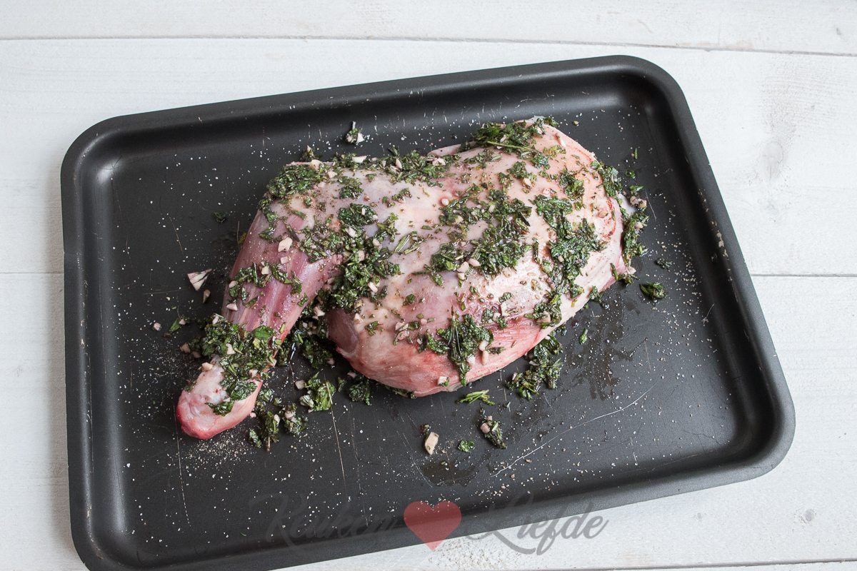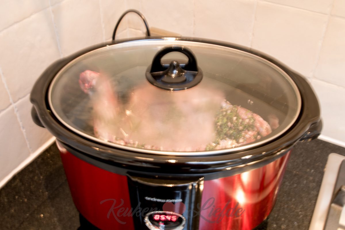 Terwijl wij op Tweede Paasdag lekker een stuk gingen fietsen, was de lam aan het garen in de slowcooker. Bij thuiskomst wachtte ons boterzacht, mals lamsvlees dat zo van het bot afviel.