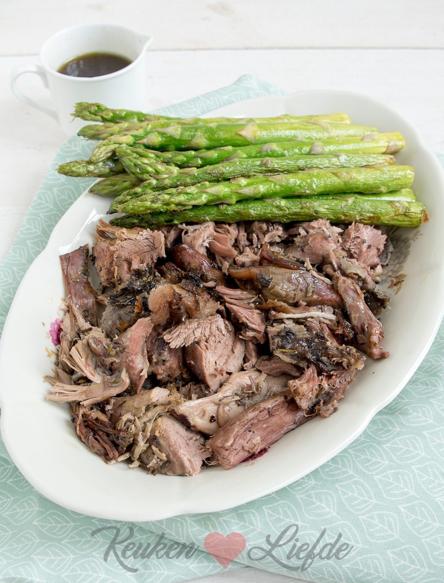 Lekker met kort gebakken of gegrilde groene asperges en gebakken aardappels. Naast de jus — de marinade uit de slowcooker — smaakt tzatziki hier ook fantastisch bij!