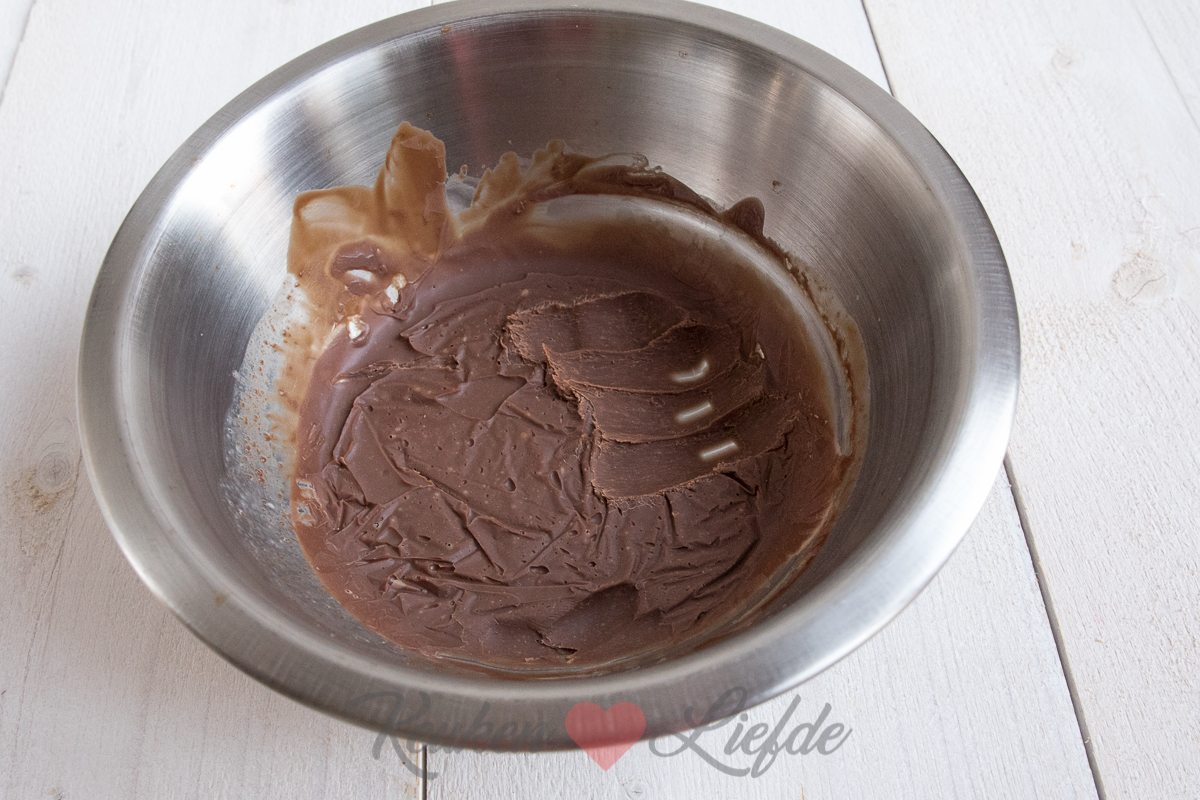 Doe alle ingrediënten voor de truffels in een hittebestendige kom en smelt au bain-marie, totdat alle chocolade is gesmolten en je een gladde massa hebt. Haal de kom van het vuur en laat afkoelen. Zet dan afgedekt in de koelkast en laat minstens 2,5 uur tot maximaal een nacht opstijven. Je kunt dit al een dag van tevoren doen.