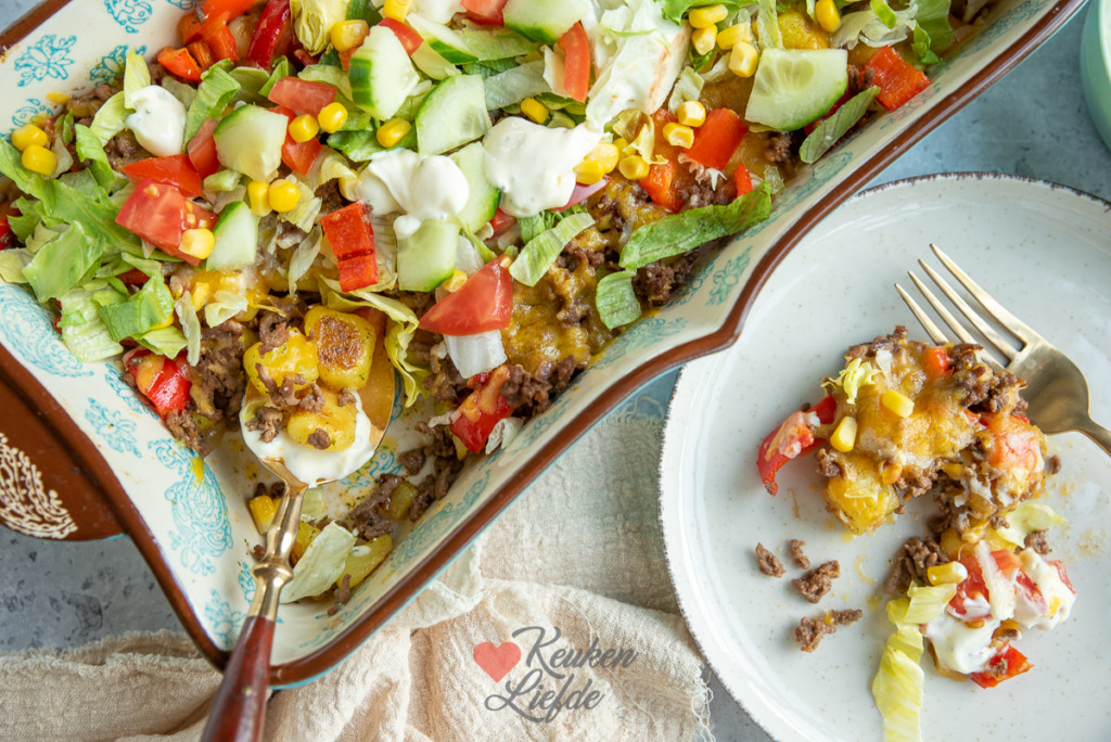 Dol op een frietje kapsalon met shoarma en knoflooksaus? Deze Mexicaanse kapsalon is een heerlijke variant die ook geschikt is voor een doordeweekse dag. De friet en shoarma zijn vervangen door krieltjes en gehakt. De gesmolten cheddar maakt het lekker smeuïg. Natuurlijk maak je het af met frisse ijsbergsla, rauwkost en zelfgemaakte knoflooksaus.