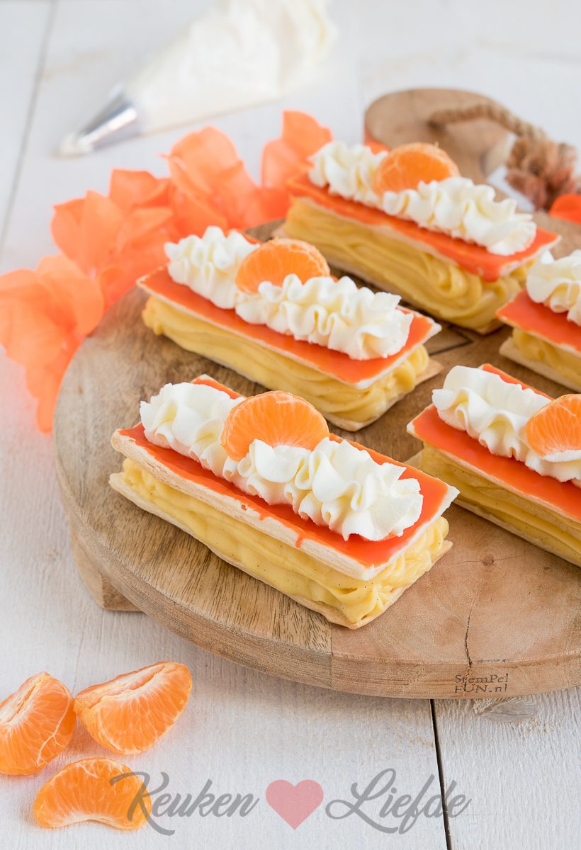 Klop de slagroom stijf met de vanillesuiker en doe in een spuitzak. Spuit de slagroom in een baan over het oranjeglazuur en garneer indien gewenst met een partje mandarijn.