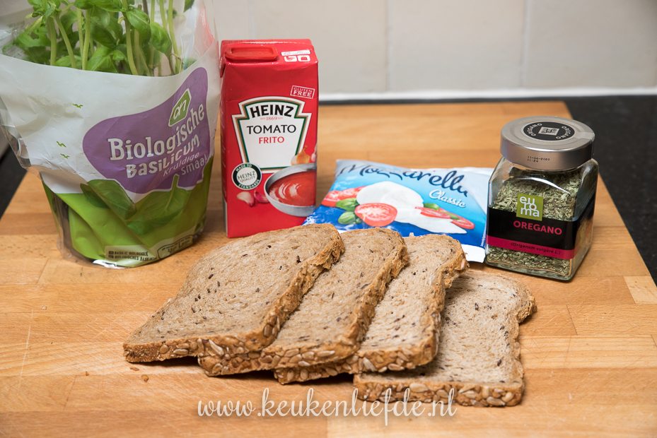 Besmeer het brood met de tomaten fritto. Beleg twee sneetjes brood met de mozzarella (houd een klein stukje over voor de bovenkant), blaadjes basilicum en een klein beetje oregano. Leg de overige twee boterhammen erbovenop en beleg met de overige mozzarella en bestrooi met oregano. Leg de boterhammen op het bakblik en bak circa 15 tot 20 minuten in de oven, of totdat het brood goudbruin en krokant is.