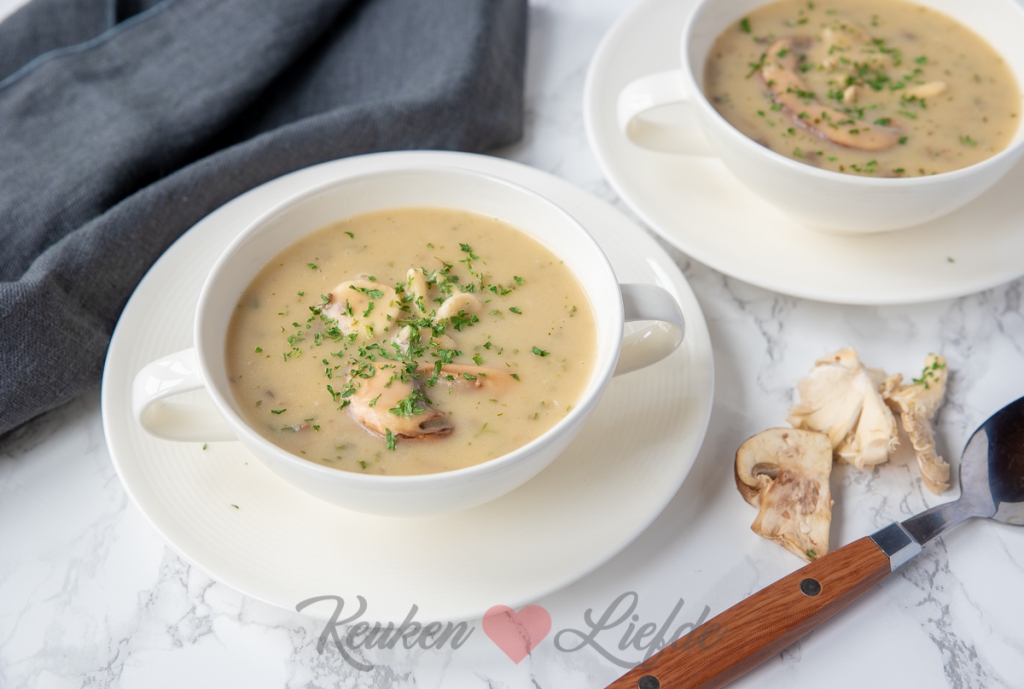 Voeg de bouillon toe en breng al roerend aan de kook. Zet het vuur wat lager en kook zachtjes verder tot de soep mooi gebonden en glad is. Voeg de paddestoelen mix, champignons en room toe en kook nog 10 minuten zachtjes mee, tot de paddestoelen en champignons zacht zijn.