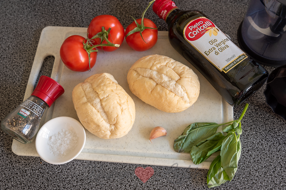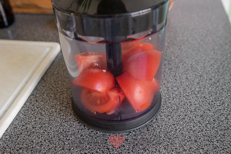 Snijd de tomaten in stukken en doe ze in de keukenmachine. Maal ze fijn tot moes. Doe de tomatenmoes in een kom en breng op smaak met een scheutje olijfolie en een snufje fleur de sel. Wrijf de fleur de sel eerst even fijn tussen je vingers voordat je hem toevoegt.