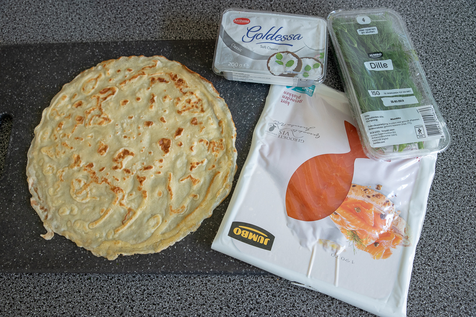 Bestrijk de pannenkoeken aan één kant royaal met roomkaas en beleg met wat plakjes gerookte zalm en versgeknipte dille. Rol de pannenkoek zo strak mogelijk op en wikkel in vershoudfolie. Draai strak dicht zoals een toffee en leg ze minimaal 30 minuten in de koelkast om op te stijven, zo kun je ze straks makkelijker snijden.