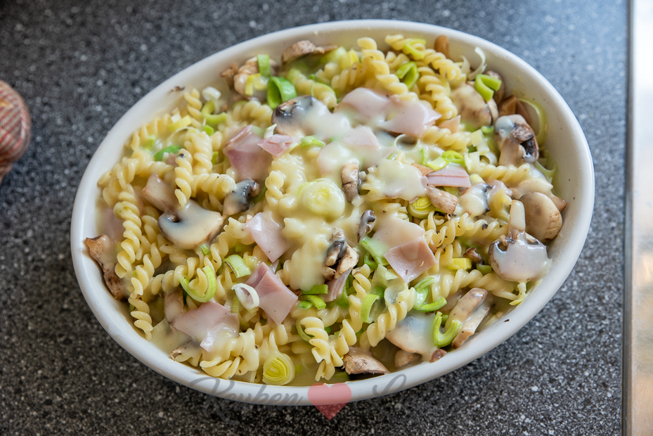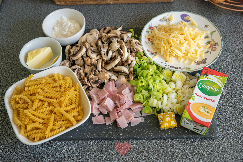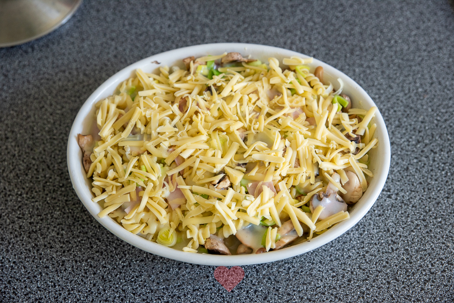 Hussel de pasta, prei, champignons en ham in een kom door elkaar en verdeel over de ovenschaal. Giet de saus eroverheen en bestrooi met de geraspte kaas. Bak in het midden van de oven 20 minuten, of tot de kaas gesmolten en goudbruin is.