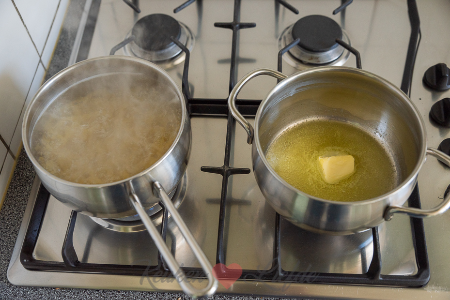 Verwarm de oven voor op 200 graden. Vet de ovenschaal in met boter. Breng een pan met water aan de kook voor de pasta.