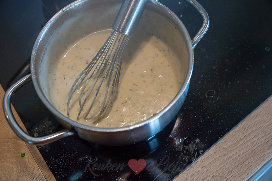 Smelt de boter in een kookpan en voeg de bloem toe. Laat de bloem al roerend op laag vuur een paar minuten garen, niet laten kleuren. Als het mengsel naar koekjes begint te ruiken is de bloem gaar. Voeg de melk en bouillon toe en breng al roerend met een garde aan de kook. Zet het vuur lager en laat de saus 5 minuten zachtjes pruttelen. Roer de dille door de saus.