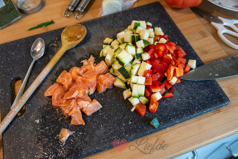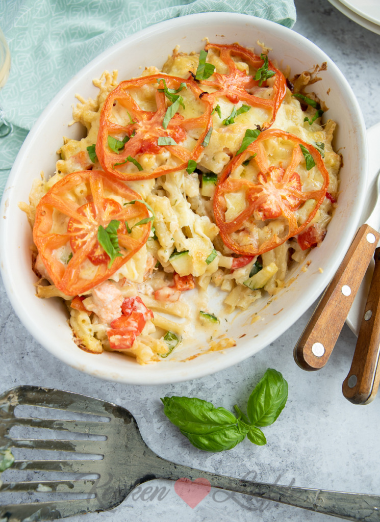 Deze pastaschotel met zalm, courgette en roomsaus is een echte familiefavoriet. Iedereen is er dol op! Bovendien is hij makkelijk om te maken. Omdat zalm snel gaar is voeg je deze rauw toe, hij gaart in de oven. Je kunt ook lekker variëren. Vervang bijvoorbeeld de courgette eens door kort voorgekookte broccoliroosjes. Het kookvocht van de broccoli kun je (met een bouillontablet erbij) als bouillon gebruiken voor de roomsaus, dat geeft een extra lekkere smaak aan de saus.