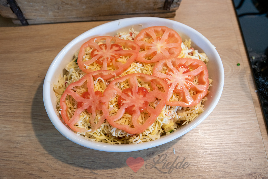 Roer de pasta, groenten en rauwe zalmblokjes door de saus en schep alles in de ovenschaal. Bestrooi met de kaas en beleg met plakken tomaat.