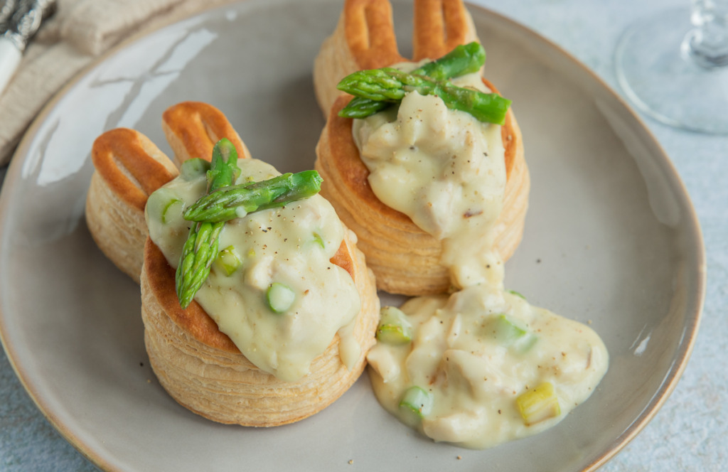 Een heerlijk pasteitje met zelfgemaakte kipragout en groene aspergetips. Omdat het bijna Pasen is serveer ik ze in paashaas-pasteibakjes. Die vind je gewoon in de supermarkt. Lekker om te serveren als voorgerecht, op de brunchtafel, of als hoofdgerecht. Met een pasteitje kun je alle kanten op.