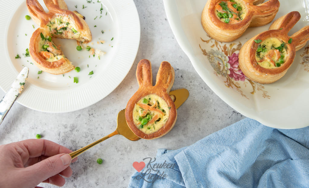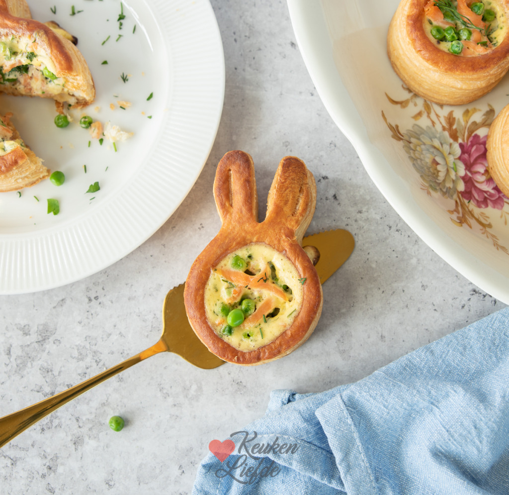 Nu het bijna Pasen is zie je in de winkel weer van die leuke pasteibakjes in de vorm van een paashaas liggen. Daar wilde ik iets mee doen. Ik besloot de ragout achterwege te laten en de pasteitjes te vullen met zalm, doperwten en een romige quichevulling van crème fraîche en ei. Een leuk voorgerecht om tijdens het paasdiner te serveren, of zet ze op tafel tijdens de paasbrunch.