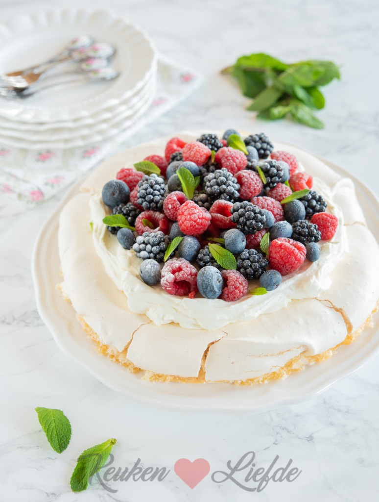 Pavlova is het favoriete dessert van dochterlief en ik snap wel waarom. Deze pavlova is gemaakt van knapperig en bros gebakken eiwitschuim (dat nog zacht is vanbinnen) en bedekt met mascarponeroom en verse bosvruchten! Het perfecte dessert om indruk te maken op gasten of familie en helemaal niet moeilijk om te maken. Geloof me, veel beter dan dit wordt het niet!