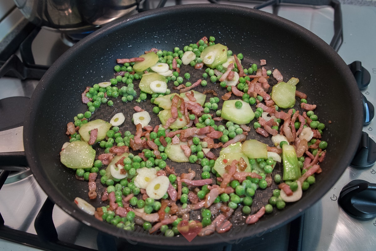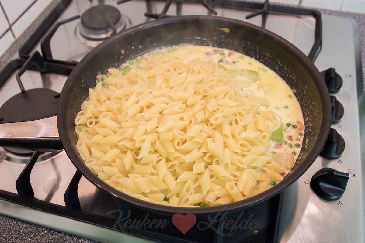 Een goede, romige pasta daar mag je me ’s nachts voor wakker maken. Dit keer had ik zin in kleine mini penne met broccoli, doperwten, spek en roomsaus. Mmmm… Tijdens het schoonmaken van de broccoli zag ik echter dat de broccoliroosjes waren aangetast en vanbinnen zwart waren. Niet tof! Omdat de broccolistronk er nog wel goed uitzag heb ik die gebruikt. Even goed schillen en vervolgens in plakjes snijden. Als je het mij vraagt is dat het lekkerste deel van de broccoli! Zo zacht en smakelijk. In de bereidingswijze van dit recept heb ik omschreven dat je de broccoliroosjes en -stronk tegelijkertijd met de pasta kunt koken omdat deze ongeveer dezelfde bereidingstijd hebben. Omdat ik nu alleen de stronk gebruikte en die in hele dunne plakjes had gesneden heb ik die samen met de doperwten gebakken in de koekenpan. Voor welke bereiding je ook kiest, je gaat ervan smullen!