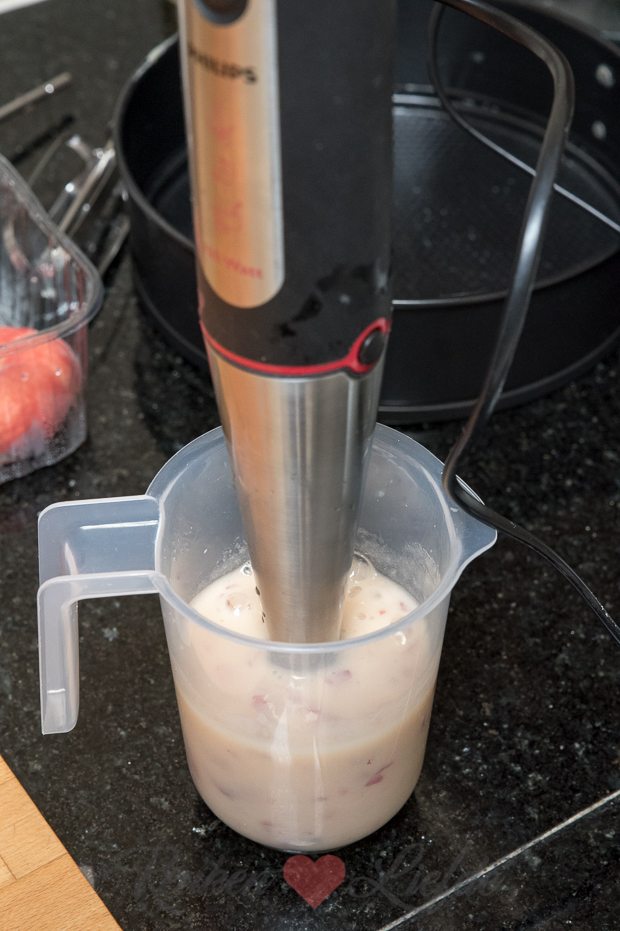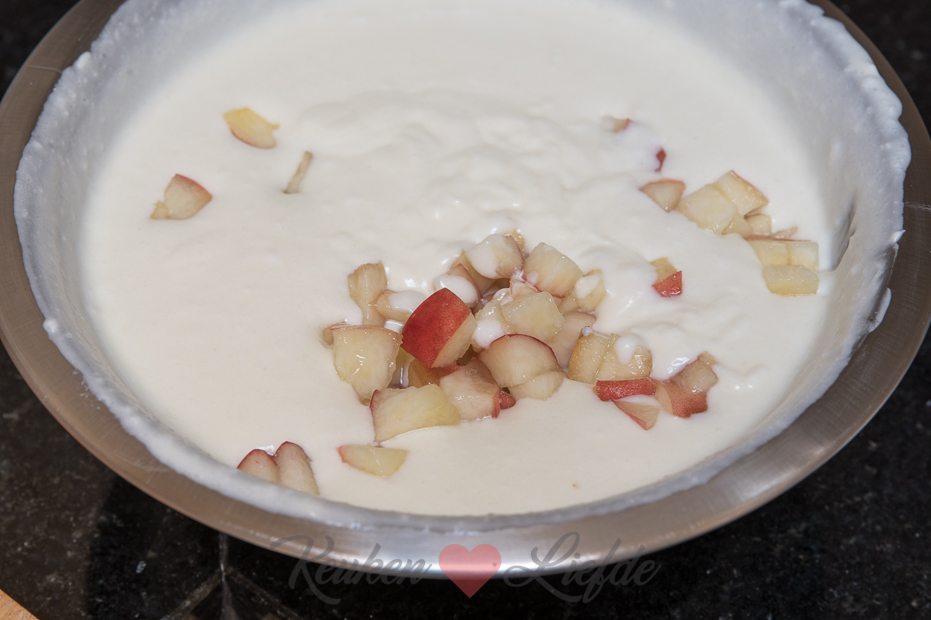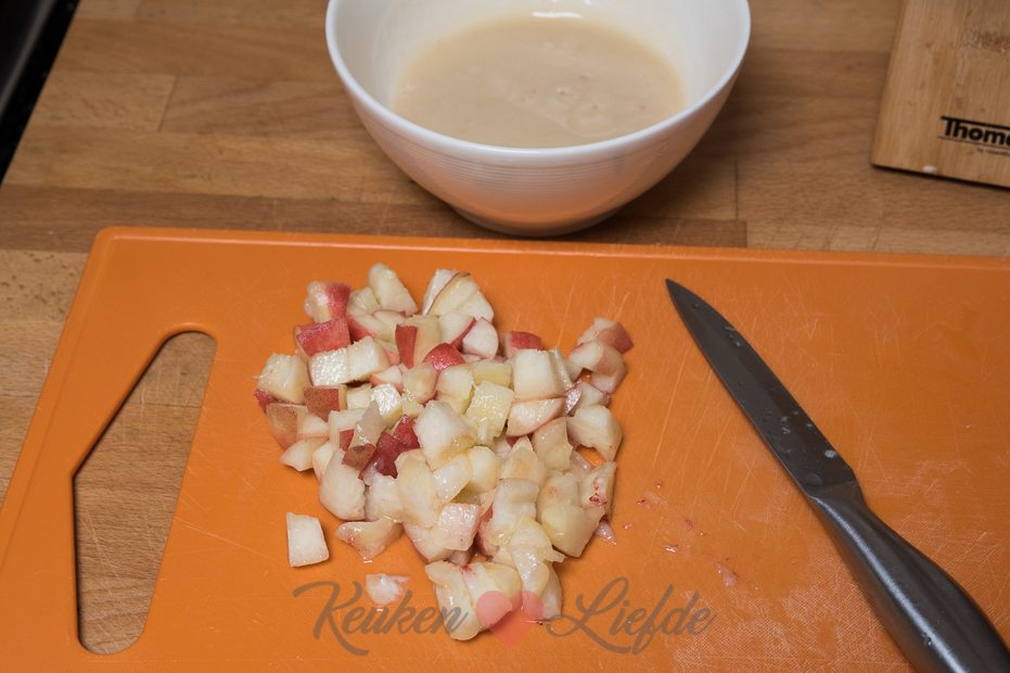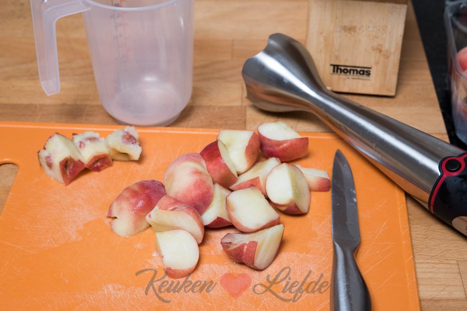 Snijd de overige perziken (houd 1 perzik achter voor garnering) in kleine stukjes. Als je wilt kun je eerst het velletje van de perzik aftrekken, bij rijpe perziken gaat dat heel makkelijk. Ik liet het velletje er gewoon aan zitten.