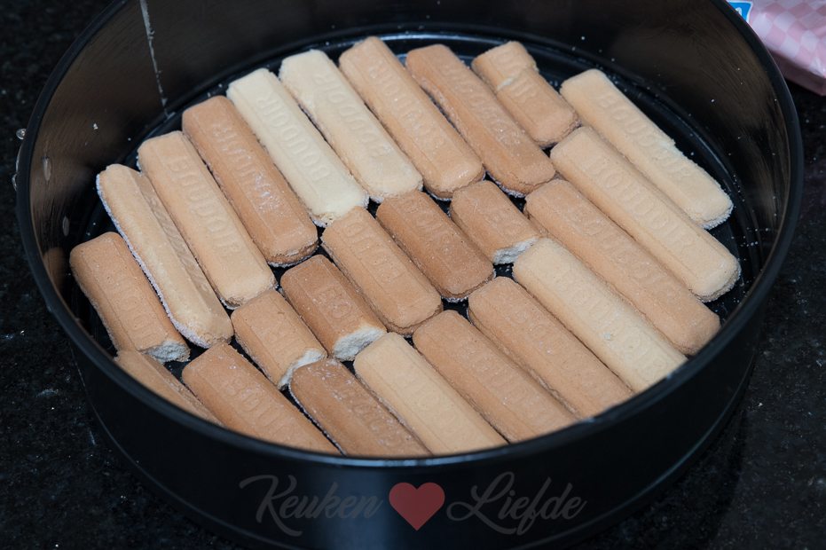 Verdeel de lange vingers (suikerkant naar beneden) over de bodem van de springvorm.