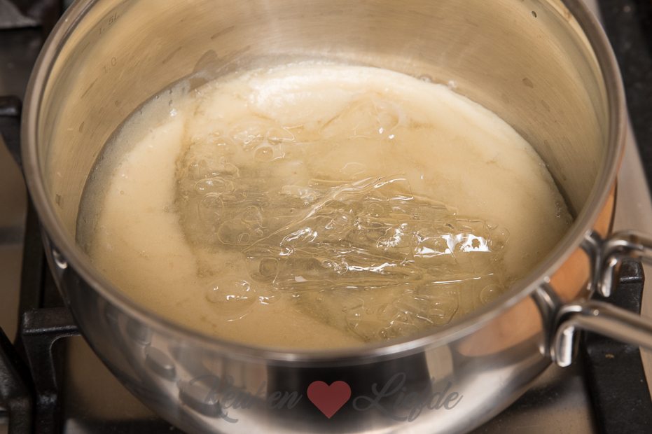 Ontpit de helft van de perziken en pureer ze tot moes met de staafmixer. Druk de moes door een fijne zeef, zodat alleen de schilletjes achterblijven. Doe de perzikmoes in een steelpan en verwarm — niet laten koken. Zet het vuur uit en voeg de uitgelekte gelatineblaadjes toe aan de warme perzikmoes. Roer totdat de gelatine is opgelost.