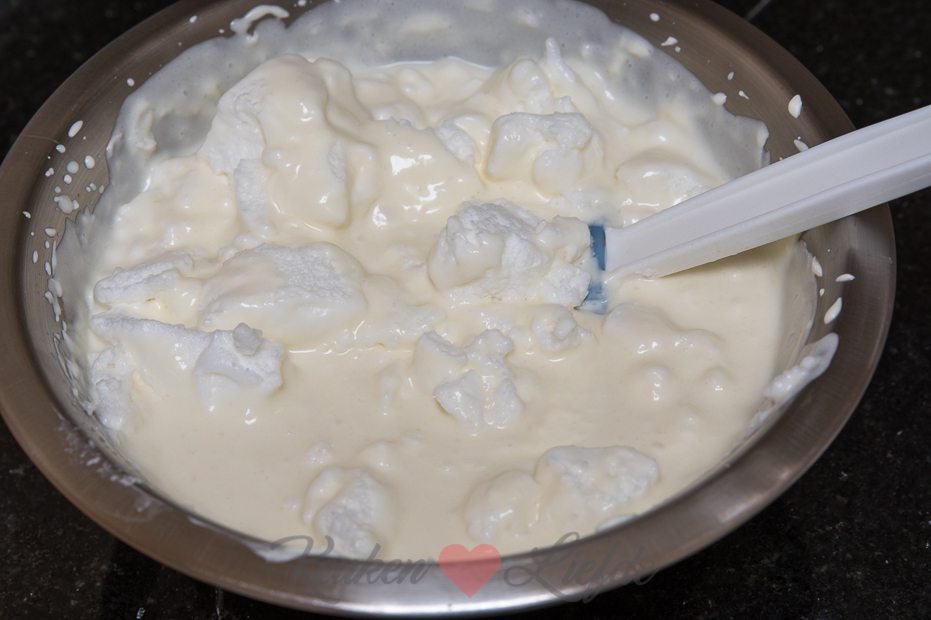 Klop de eiwit met de mixer tot stijve pieken. Klop in een andere kom de slagroom stijf. Klop in een derde kom de kwark en suiker door elkaar. Roer de perzikmoes door de kwark. Spatel de slagroom en het eiwit door de kwark en tot slot de perzikstukjes.
