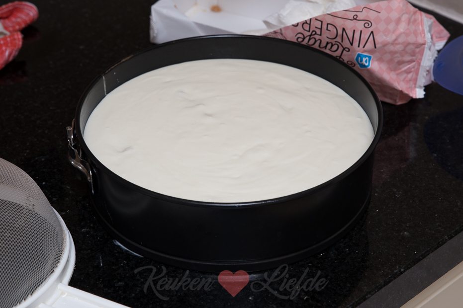 Verdeel het kwarkmengsel voorzichtig over de lange vingers in de springvorm. Ga de springvorm niet schudden of te hard bewegen, want dan kunnen de lange vingers naarboven komen drijven.