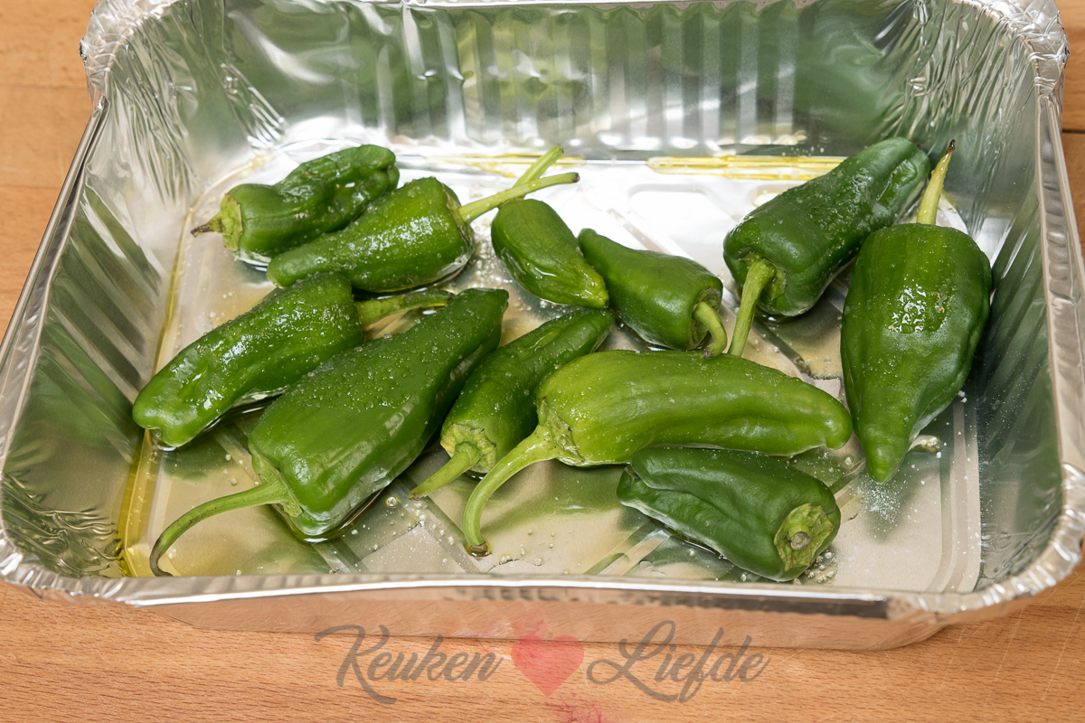 In plaats van in de koekenpan kun je pimientos de padrón ook perfect grillen op de barbecue. Leg ze daarvoor in een aluminium barbecuebakje en hussel om met wat olijfolie. Zet het bakje op de barbecue en grill ze circa 8 minuten tot ze gekleurd en zacht zijn.