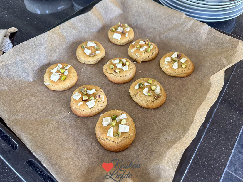 Bak de koekjes 12 tot 15 minuten in het midden van de oven, of tot ze licht goudbruin zijn, dan zijn ze nog lekker chewy. Haal de koekjes na 6 minuten uit de oven en beleg ze met de pistachenootjes en overige witte chocolade en bak nog even verder.