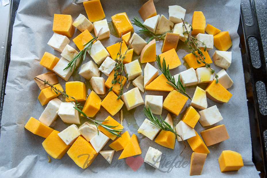 Verdeel de pompoen, knolselderij, knoflook, rozemarijn en 1 takje tijm over het bakblik. Besprenkel met een goede scheut olijfolie en bestrooi met wat zeezout uit de molen. Hussel om zodat alles bedekt is met een dun laagje olie.