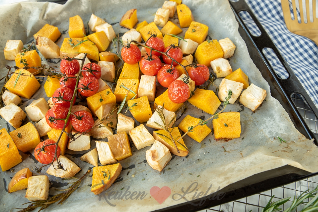 Een lekker groentegerecht op tafel zetten zonder veel moeite? Groenten uit de oven zijn lekker en gezond! Deze pompoen, knolselderij en trostomaat worden lekker zacht en zoet door ze te roosteren in de oven. Op wat snijwerk na heb je er bijna geen werk aan.