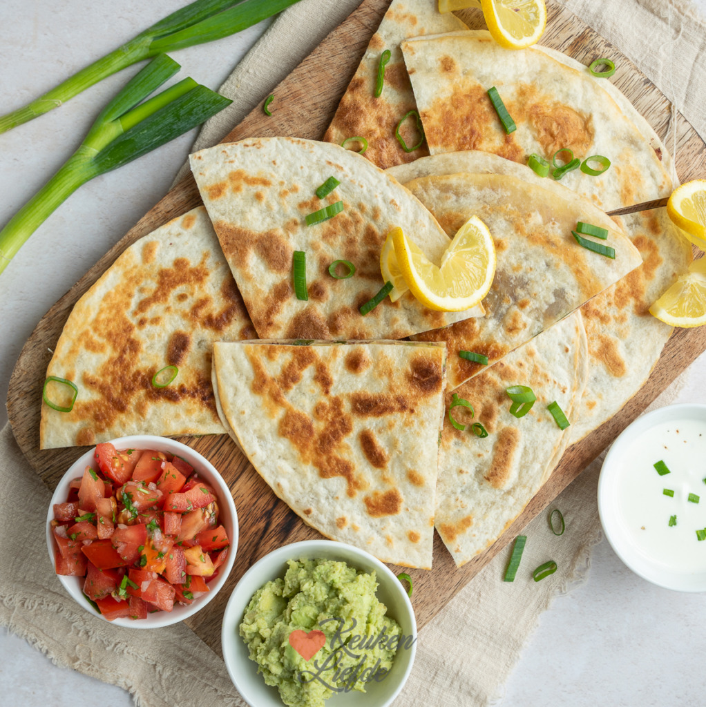 Deze Mexicaanse quesadilla met kaas, bosui en bonenpuree is heerlijk als vegetarische maaltijd of lunch. Serveer met zelfgemaakte guacamole, tomatensalsa en zure room om het smulfeest compleet te maken.