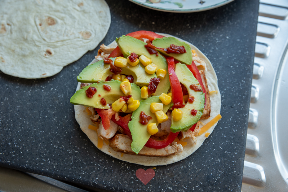 Beleg twee tortillawraps met de helft van de cheddar, gevolgd door de kip, avocado, paprika, mais, jalapeño en bestrooi met de overige cheddar. Dek af met de overige twee wraps.