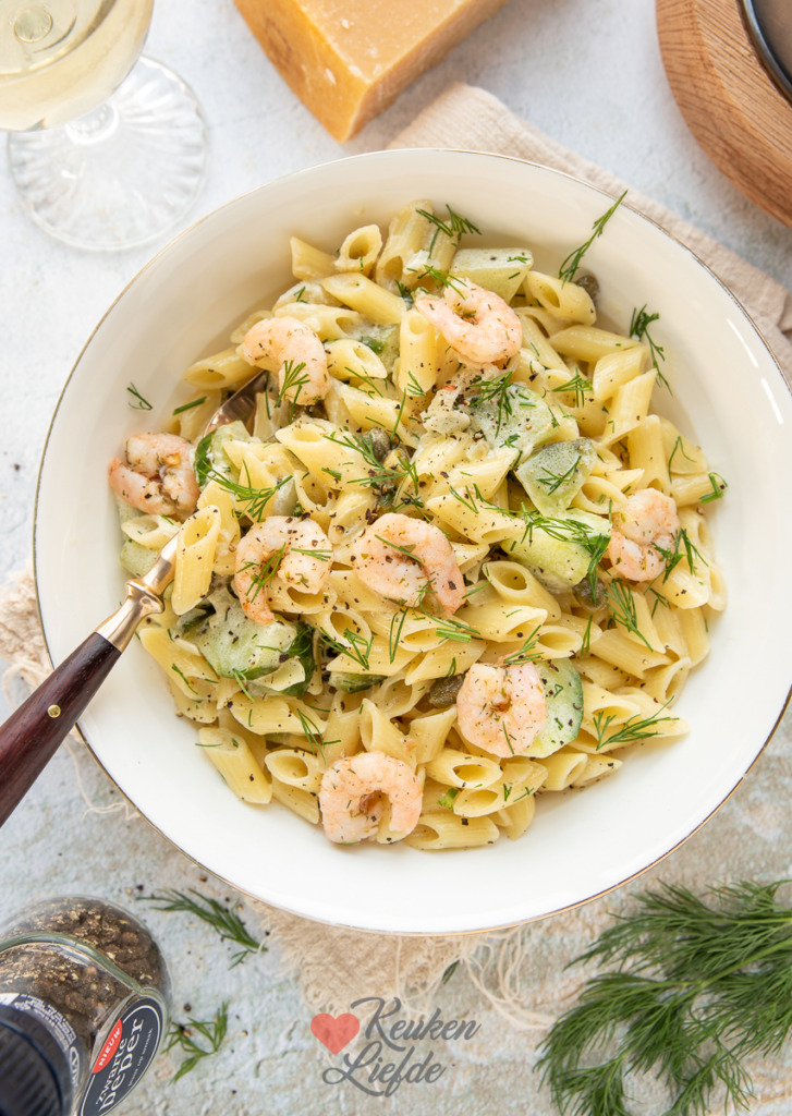 Een heerlijke pasta met komkommer, dille-roomsaus en garnalen. Makkelijk om te maken en binnen 20 minuten op tafel.