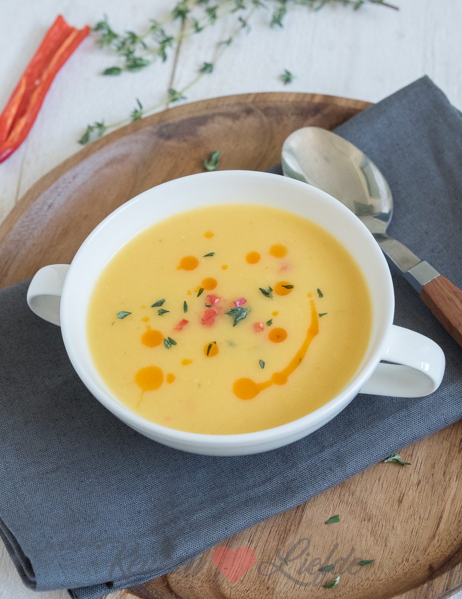 Verhit een soeppan met een scheut olijfolie en voeg de pompoen, ui, knoflook, laurier, tijm en chilipeper toe (houd wat tijmblaadjes en chilipeper achter voor garnering). Fruit circa 6 minuten op zacht vuur tot de pompoen wat zachter begint te worden.