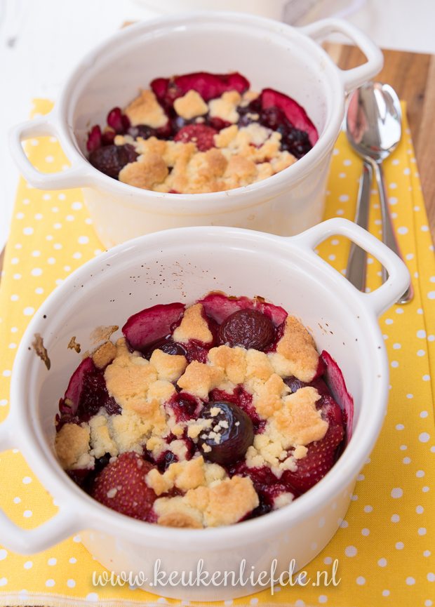 Een van de lekkerste desserts die je kunt maken met vers rood zomerfruit is deze rood fruit crumble! Je maakt het helemaal af met een bolletje vanille-roomijs. Onweerstaanbaar lekkere verwennerij voor jong én oud! Dochterlief laat zien hoe eenvoudig je dit maakt.