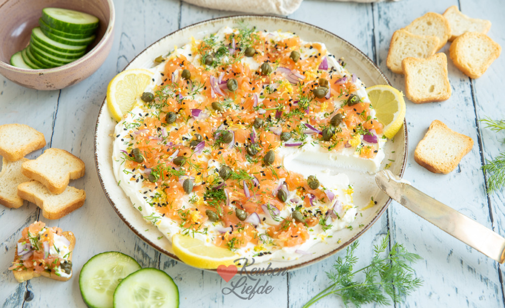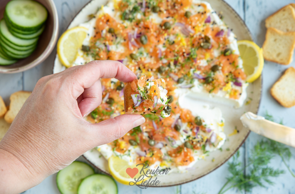 De basis van dit borrelbord is de roomkaas, dus kies een neutrale, verse roomkaas die makkelijk smeerbaar is. De topping van zalm, frisse citroenrasp en kappertjes, dille en sesamzaadjes maken er een feestelijke roomkaasdip van.