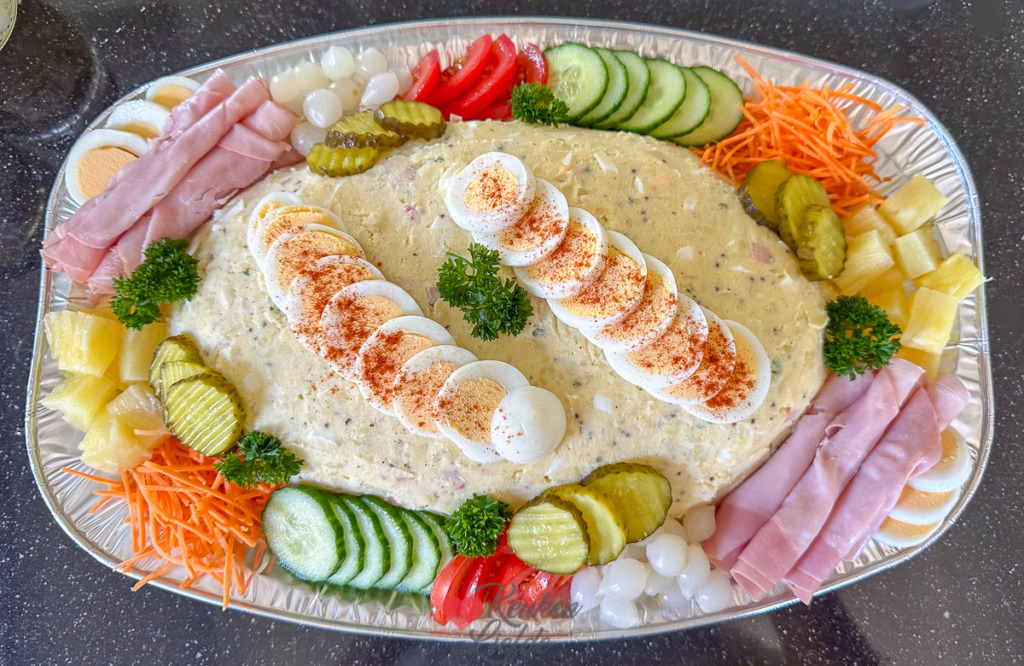 Een heerlijke Russische salade van zachte aardappelpuree met wortel en doperwtjes, ham, hardgekookt ei en een romige dressing van mayonaise. Het verschil met de huzarensalade zoals wij die in Nederland vooral kennen is dat in de Russische variant vaak hardgekookt ei zit.