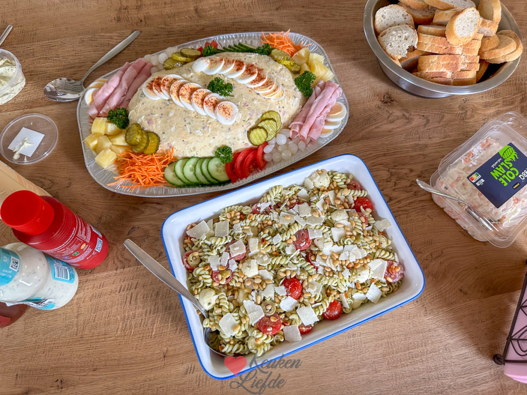 - Plakjes ei of gevulde eitjes, plakjes komkommer, cherrytomaatjes, ananas, wortel julienne, verse kruiden (zoals peterselie of dille), tafelzuur zoals schijfjes augurk of zilveruitjes, vleeswarenrolletjes.