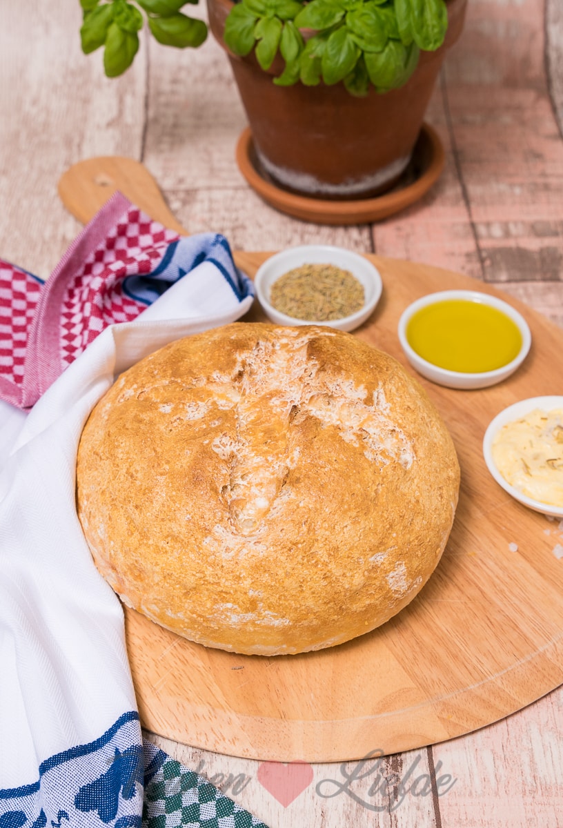 Stort de deegbal op een licht bebloemd werkblad en vorm er met je handen een rond, bol brood van. Bekleed een bakblik met bakpapier. Kerf de bovenkant van het brood met een scherp mes kruisvormig in en leg het brood op het bakblik. Zet een grote pan omgekeerd over het deeg op het bakblik en zet het bakblik nog 15 minuten op een warme plek (bijvoorbeeld naast de verwarming) om na te rijzen.