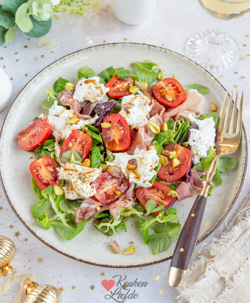 Een heerlijke salade met frisse tomaat, romige burrata en zoutige parmaham. De pistachenootjes geven een lekkere crunch en maken het helemaal af. Serveer deze salade als voorgerecht met kerst of een andere feestdag, of geniet ervan als lunch.