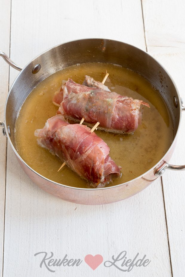 Leg de plakken parmaham op een snijdplank en leg op elke plak een blaadje salie. Bestrooi de kalfsschnitzels aan beide kanten met zout en peper. Leg de schnitzels op de parmaham en rol strak op. Zet vast met een houten prikker en wentel de vleesrollen door een bord met bloem.