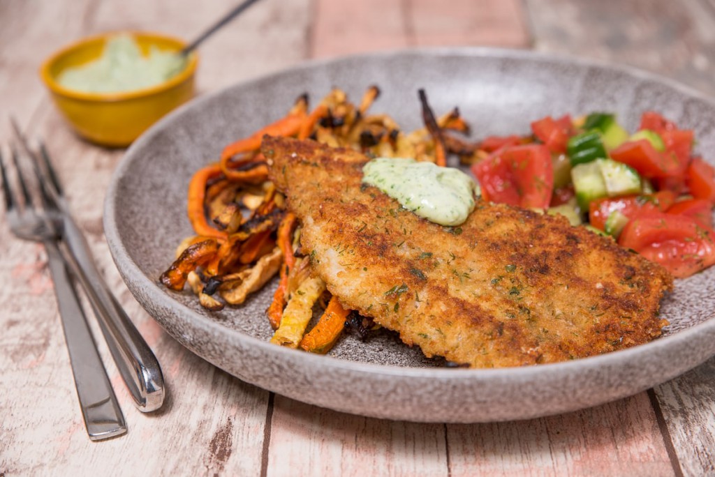 Serveer met rauwkost of salade en groentefriet uit de oven. Voor een lekker sausje mix je wat verse tuinkruiden (bijv. peterselie en bieslook) fijn met mayonaise. Smullen maar!