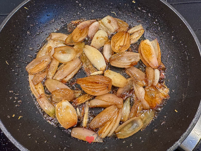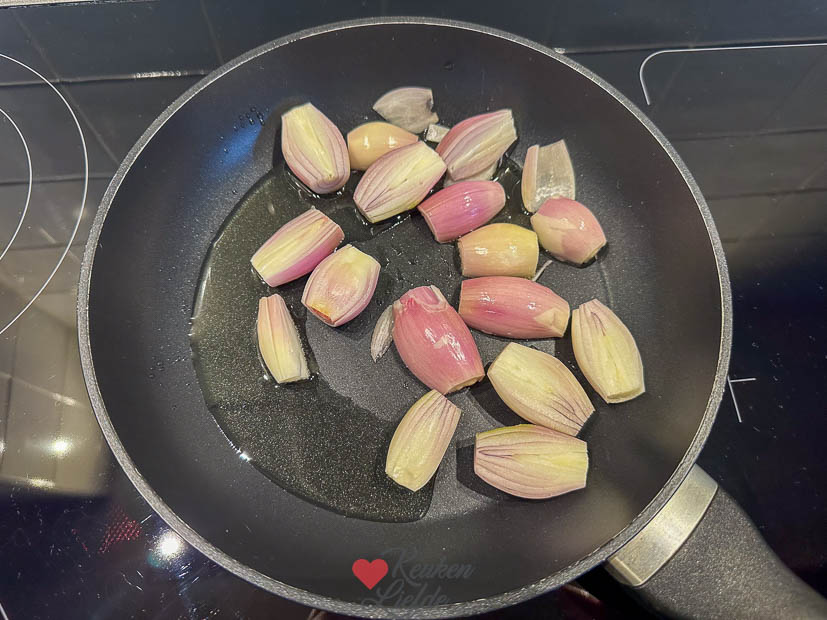Ik gebruik belegen kaas omdat die pit heeft en lekker romig is. Maar je kunt ook andere kaas gebruiken. Zowel zachte als harde geitenkaas of gruyère combineren ook goed met de gekarameliseerde sjalotten.