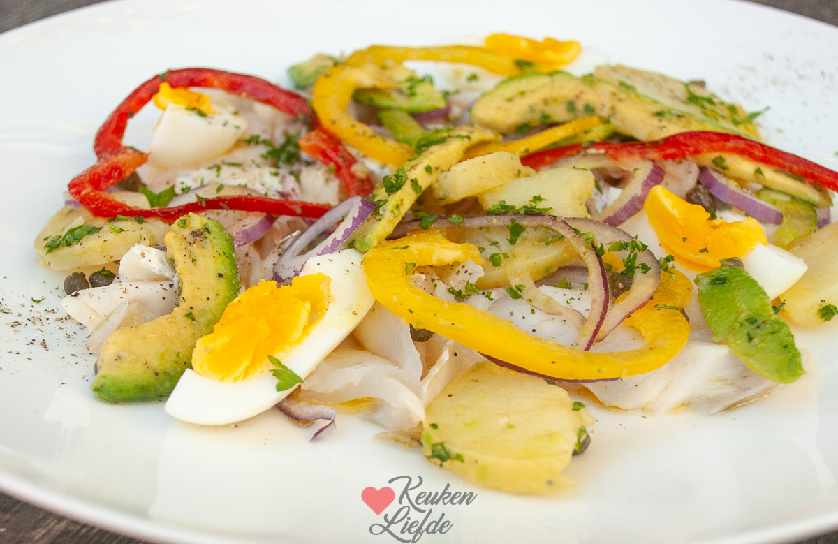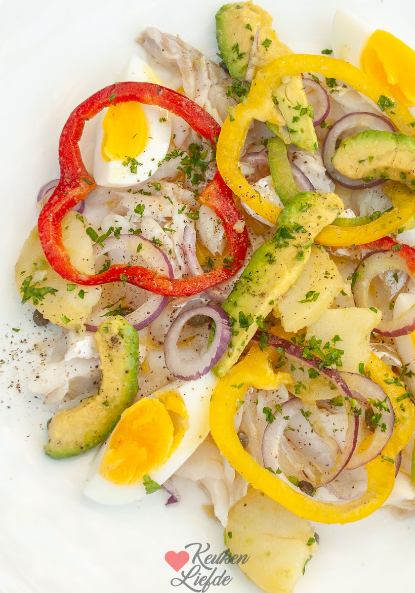 Een heerlijk licht zomergerecht om te serveren tijdens een etentje met vrienden of familie: schelvissalade met gemarineerde paprika, aardappel en avocado. Met een goed glas wijn — zie onderstaande wijntip van Wijngek Martin — en goed gezelschap is dit elegante visgerecht genieten pur sang!