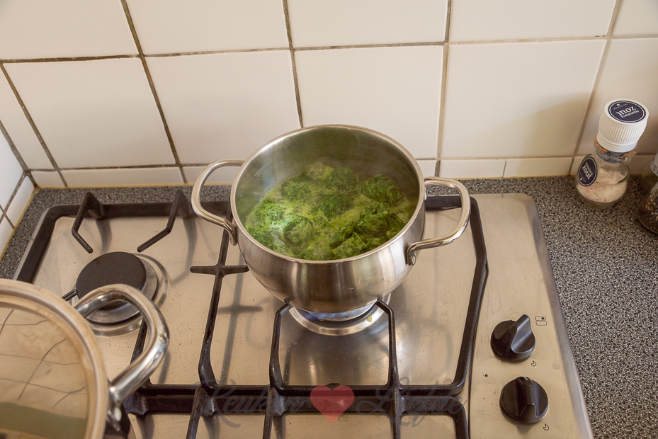 Giet de aardappels af en stamp ze fijn. Roer de spinazie à la crème en Parmezaan (houd wat achter voor garnering) door de aardappelpuree. Proef en breng indien nodig extra op smaak met zout en peper uit de molen. Als je van pit houd net zoals ik kun je ook een snuf gedroogde chilivlokken toevoegen. (Zie ook onderstaande tip!)