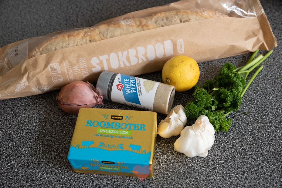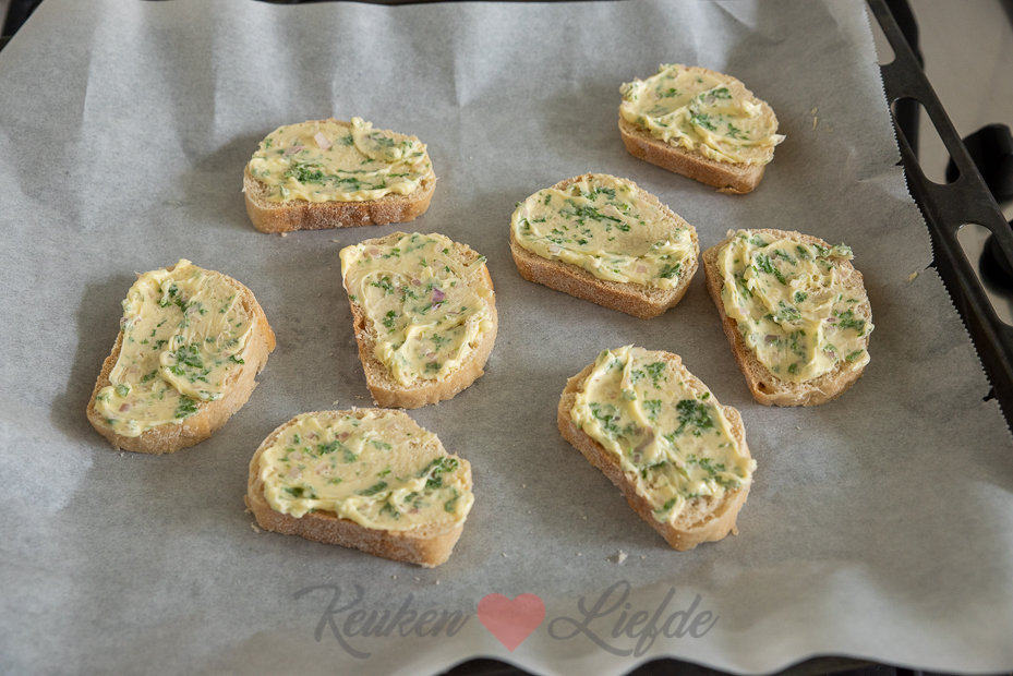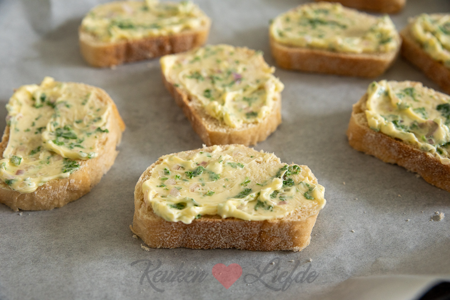 Besmeer de stokbroodjes met een laagje kruidenboter. Bak in het midden van de oven circa 10 minuten, of tot de stokbroodjes goudbruin zijn. Serveer direct.