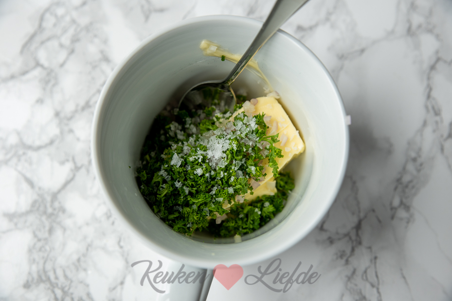 Roer in een kommetje de boter, sjalot, knoflook, peterselie en citroensap door elkaar. Breng op smaak met een snufje witte peper en wat fleur de sel (knijp de fleur de sel fijn tussen je vingers voordat je het toevoegt).