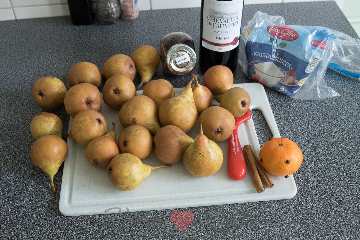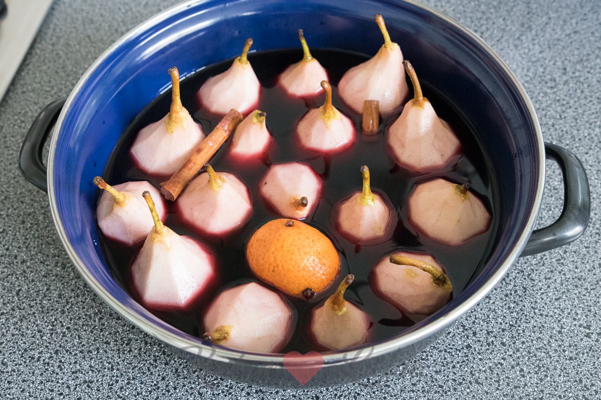 Op de foto hierboven had ik niet genoeg rode wijn om de stoofperen volledig onder te zetten, dus heb ik het verder aangevuld met water.