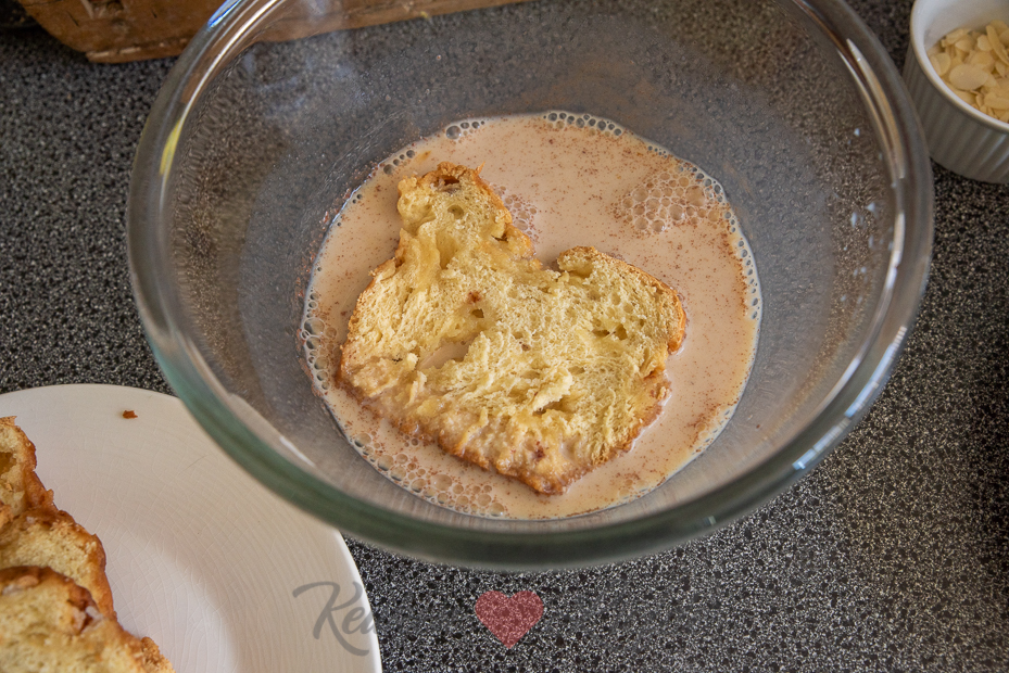 Serveer de suikerbroodwentelteefjes met de warme kersen en siroop en bestrooi met de geroosterde amandelen. Lekker met een dot lobbig geklopte slagroom.