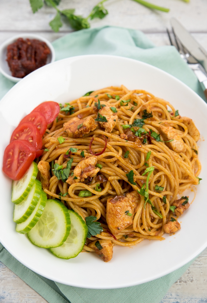 Voeg de spaghetti en de selderij toe en hussel goed door het kipmengsel. Verwarm tot alles door en door warm is.