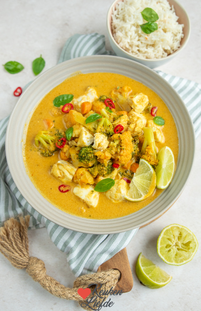 Een heerlijke Thaise curry met kabeljauw, verse groenten en romige kokosmelk. Een makkelijk en snel eenpansgerecht waar je alleen wat rijst bij hoeft te koken. Zie ook de tip voor een variant dat wij vaak maken.